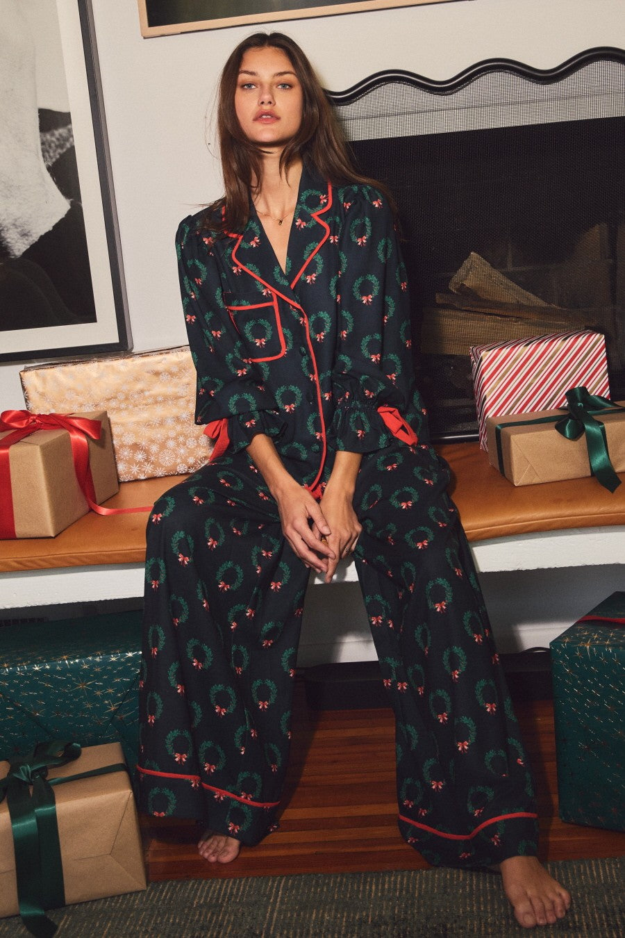 Wreath print, piped trim, and contrast ribbon accents pajama pants.