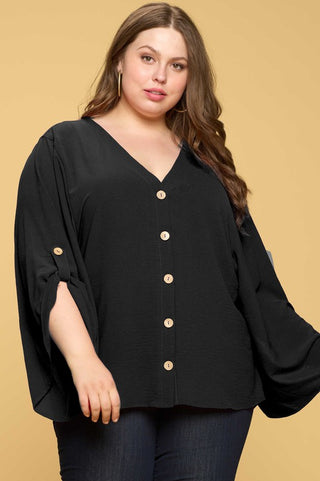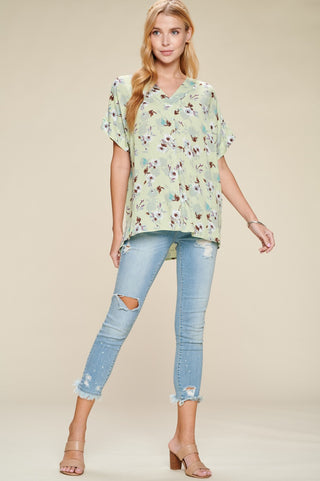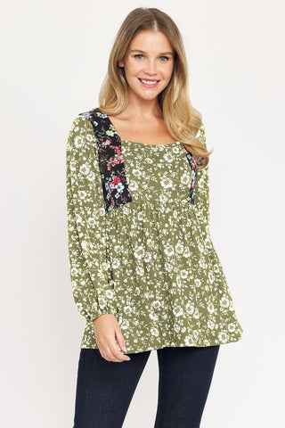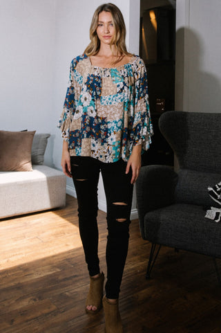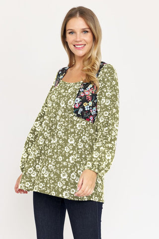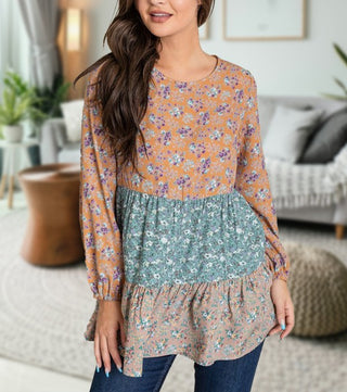 Women Patchwork Ruffled Hem Round Neck Blouse