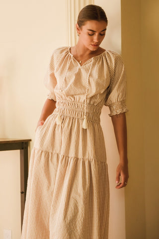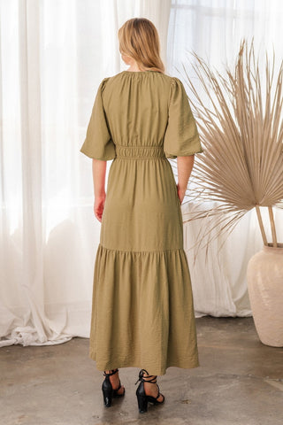 She + Sky Printed Notched Woven Tiered Pintuck Maxi Dress with Side Pockets