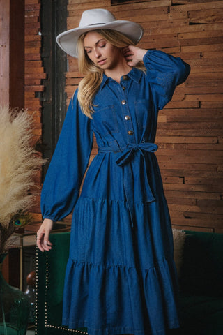 Washed Denim Tiered Shirt Midi Dress