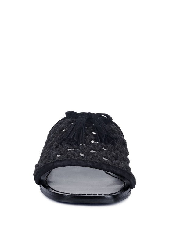structure with soft suede frame detail and the tassels at the top. The square toe open slides are casual, comfort shoes from Rag & Co.